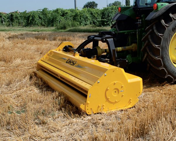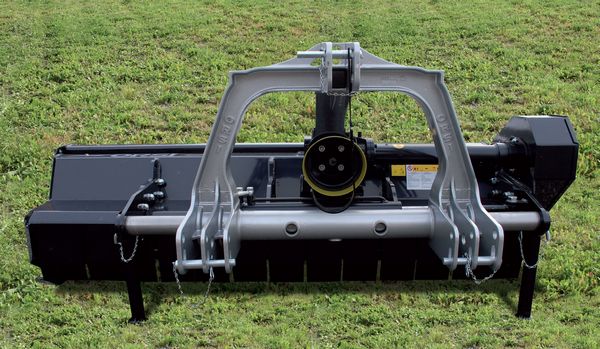 Double frame, toothed static knife, removable bonnet for inspections, pressed rotor supports, rear roller ø 195 mm, gearbox w/free wheel, manual side shift kg 60, protection flaps 5mm thickness, automatic belt tensioner, reflectors, tool screws in steel 12.9